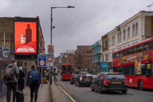 A digital advertising screen in East London’s Bethnal Green Road, benefiting from a busy street…